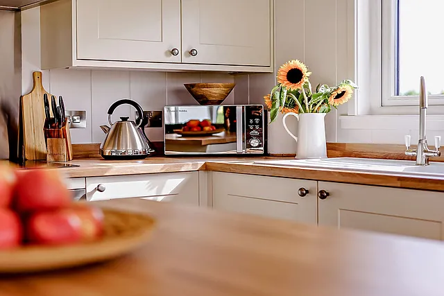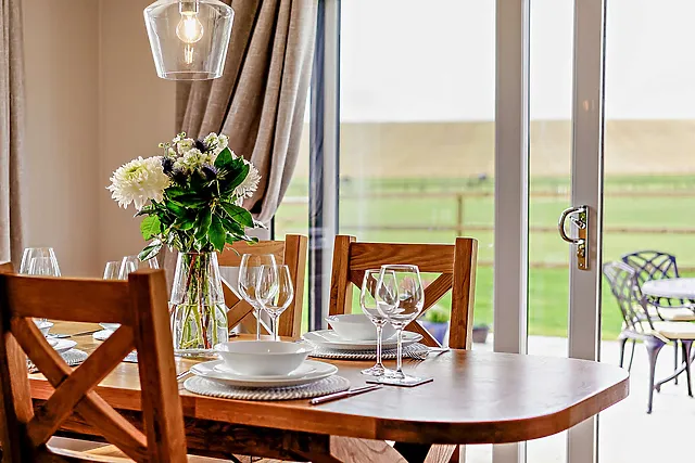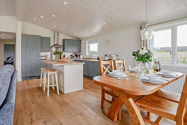 Experience the ultimate relaxation in your private hot tub, gazing out over the open fields, or cosy up in the spacious lounge with a Smart TV and an elegant electric fire. The bespoke kitchen is fully equipped, allowing you to create delightful meals to be enjoyed in the stylish dining area.