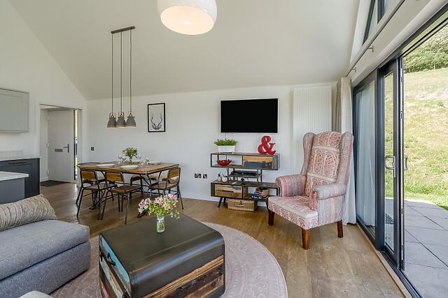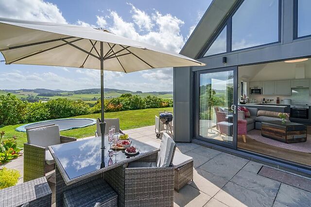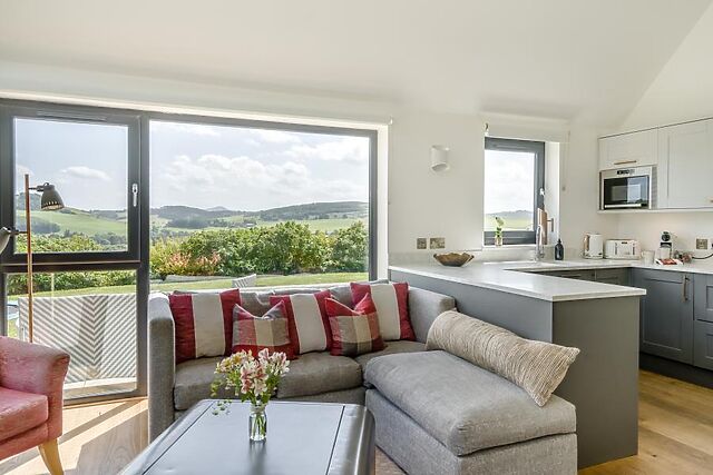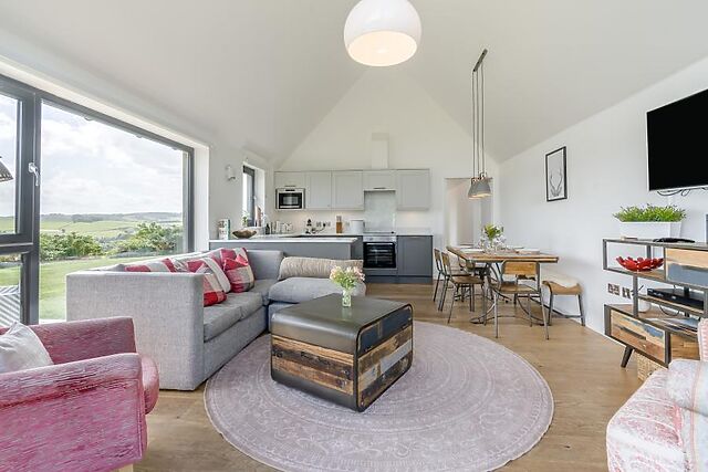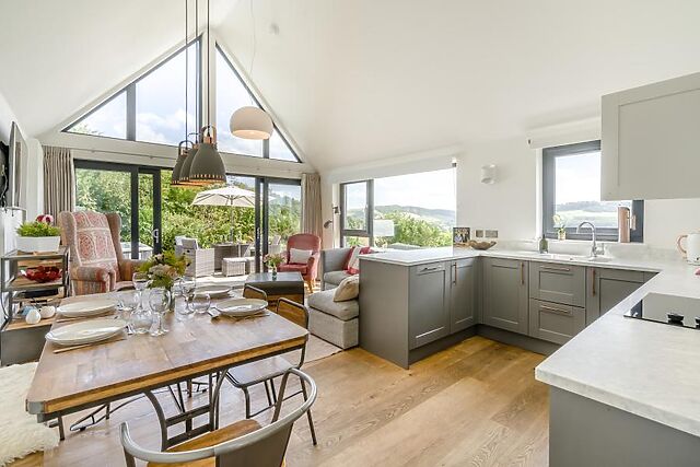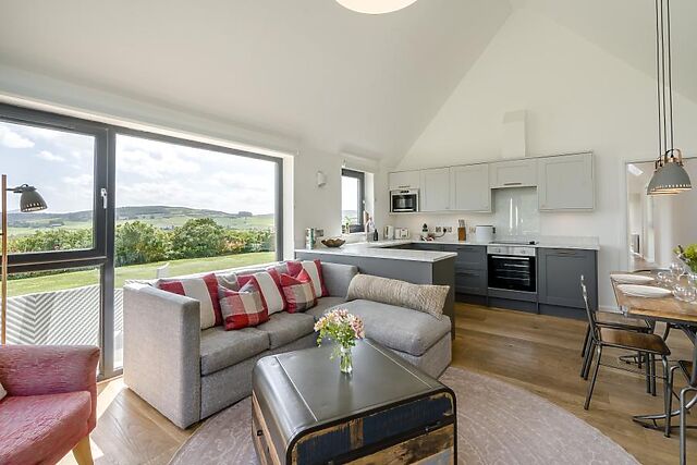 Enter this countryside escape and head straight through the hallway into the heart of the home – a spacious open-plan lounge, kitchen and dining area designed for relaxing, entertaining, and soaking up the views. The lounge is a haven of comfort, with inviting sofas positioned to take in the sweeping panoramic vistas through floor-to-ceiling windows and French doors that open onto the enclosed garden.