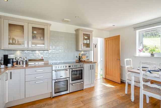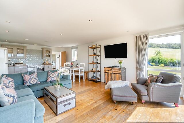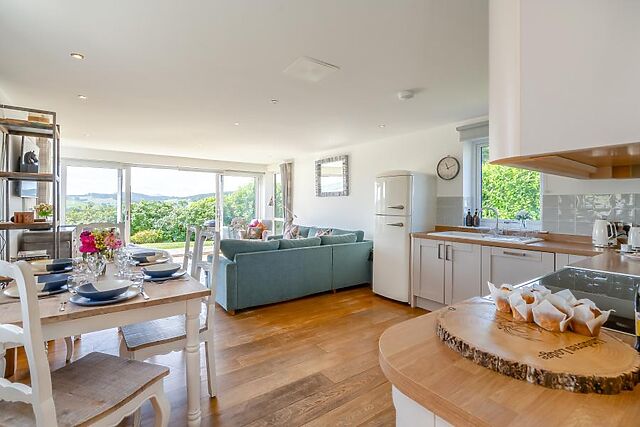 On the ground floor, you'll find a super-king-size zip-and-link bedroom (which can be made into twins on request) located next to a spacious and accessible wet room for multigenerational holidays or guests with mobility needs. The heart of the home is the large open-plan living room, which effortlessly blends the lounge, kitchen and dining areas.