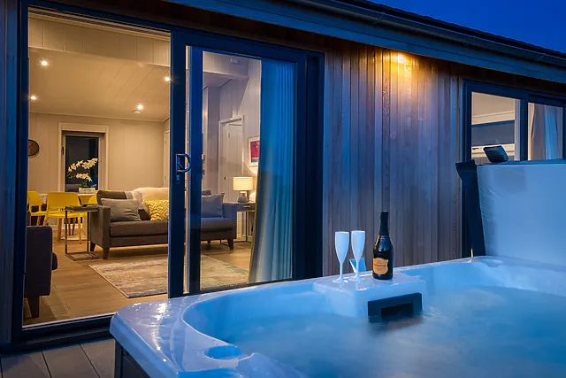 The heart of the lodge is the open-plan lounge/kitchen/diner, complete with a wood burner and state-of-the-art kitchen. Step outside to the enclosed patio, where you can unwind in the private hot tub under the stars, making for an unforgettable experience.