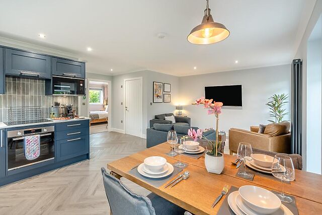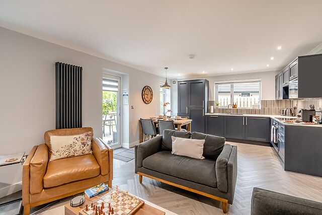 Whether it's a romantic dinner or a lively family gathering, the dining area awaits with patio doors leading to the garden. Off the hallway, you’ll find two beautifully decorated bedrooms – a king-size retreat and a cosy twin – both thoughtfully designed for a restful night’s sleep.