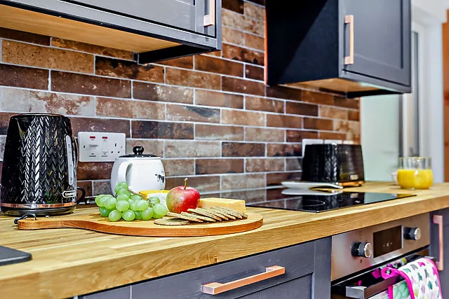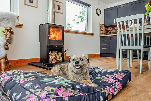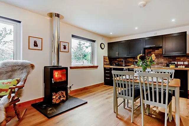 Inside, find a welcoming open-plan living space with a wood burner, creating a warm and inviting atmosphere. The well-equipped kitchen allows for home-cooked meals to be enjoyed at the dining table.