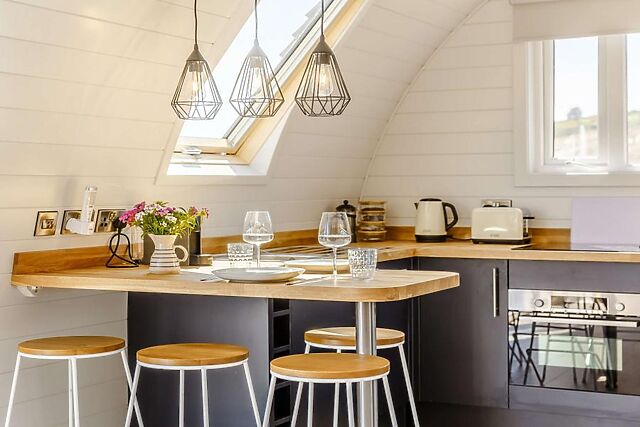 The cosy lodge features an open-plan living space with a wood burner, ensuring warm and inviting evenings.
