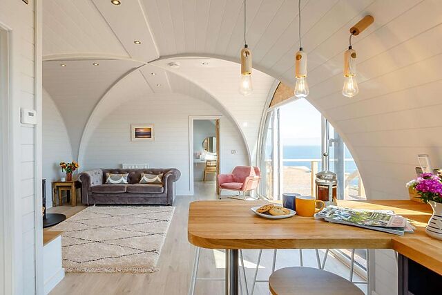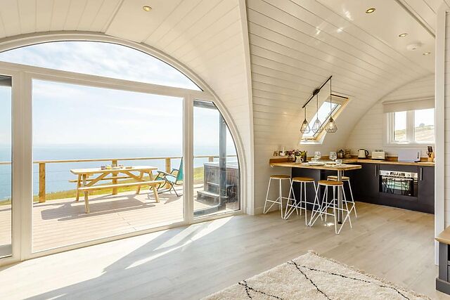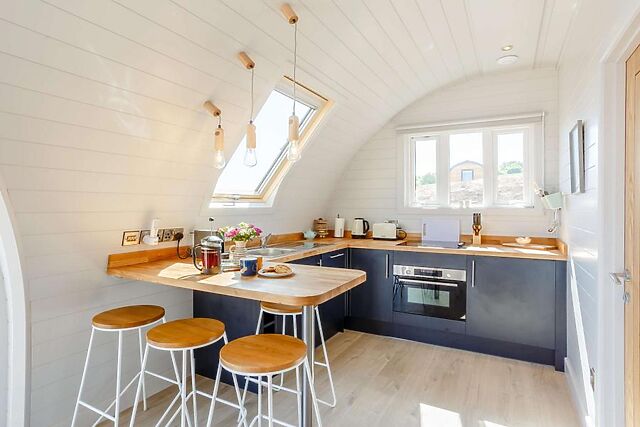 The lodge's interior is equally impressive, with a cosy wood burner, Smart TV, and Bluetooth speaker in the lounge area, complemented by panoramic sea views. A fully equipped kitchen and a welcome pack with homemade goods add to the charm of your stay.