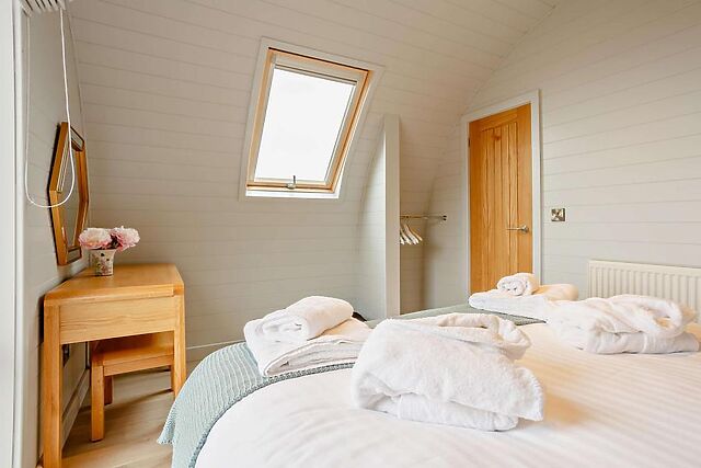 The accommodation comprises two tastefully furnished bedrooms, one king-size and one twin, ensuring comfort for couples or a small family. A well-appointed shower room caters to your needs. The open-plan living space, complete with a Smart TV and Bluetooth speaker, is designed to maximize the stunning countryside views. The kitchen is equipped with modern appliances, including a Nespresso coffee machine.
