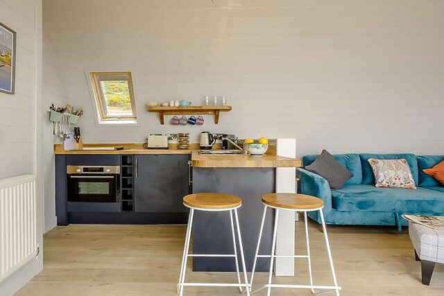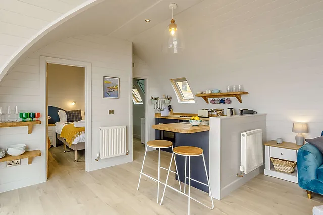 The open-plan living area, complete with a Smart TV and Bluetooth speaker, offers a cosy space for relaxation, while the kitchen is fully equipped for all your culinary needs.