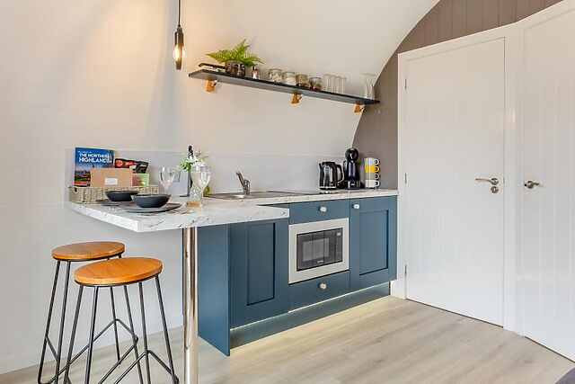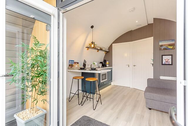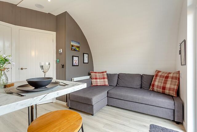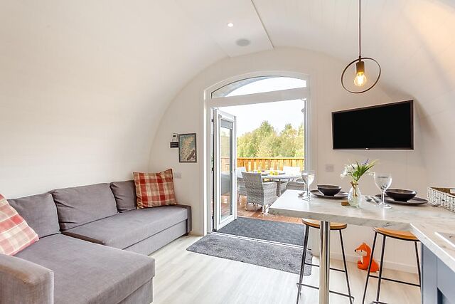 To one side of the property’s open-plan space is a compact yet practical kitchen with everything you need to rustle up breakfasts, lunches and dinners, alongside a breakfast bar. A comfortable sofa and Smart TV adorn the other side, so you can curl up and watch films in the evening.