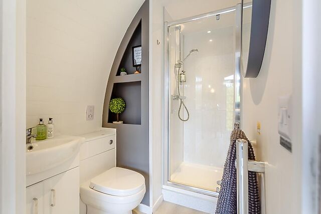 The welcoming double bedroom at the back of the lodge is a sumptuous space to unwind and has its own Smart TV. Adjacent is a stylish shower room.