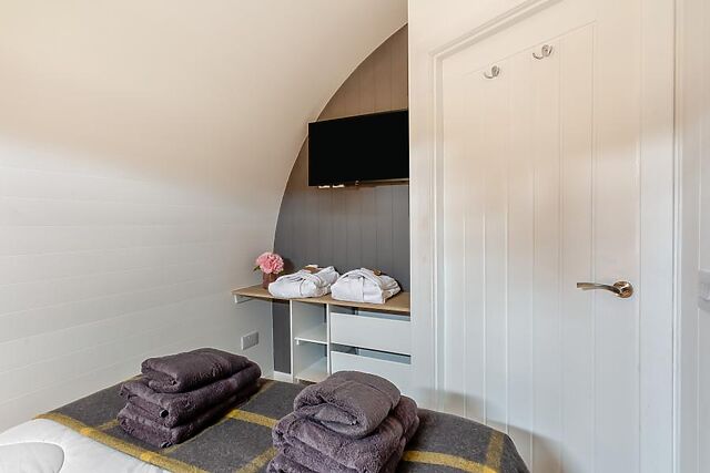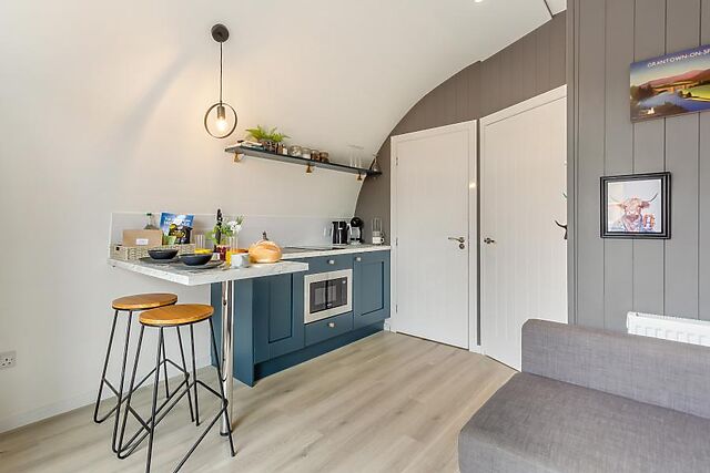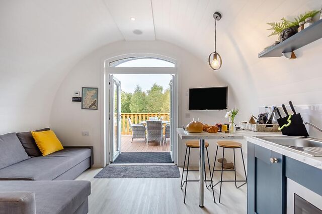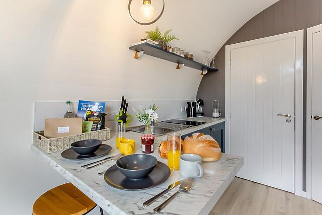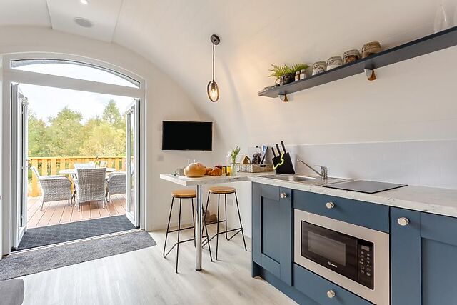 Park up in your private parking space and head through your private patio garden into this spacious pod. Upon entering you will find a compact yet practical kitchen area on one side, which has a breakfast bar and all the amenities you will need to create quick breakfasts, prepare picnics and delicious dinners.