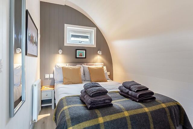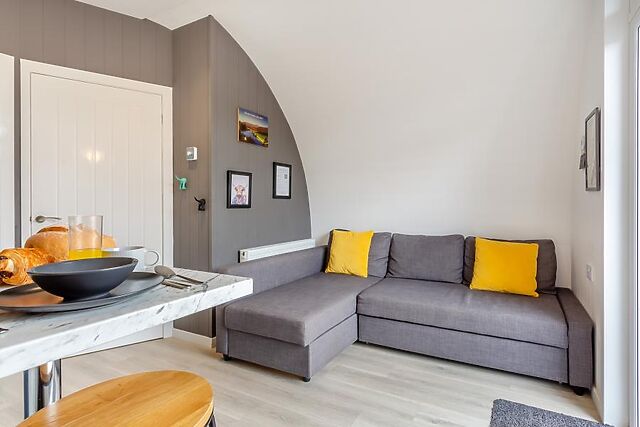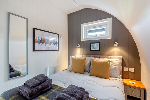 The other side of the living space has a comfortable sofa with a view of the Smart TV so you can curl up on chilly evenings. At the rear is a warm and welcoming bedroom which contains a sumptuous double bed and another Smart TV for lazy mornings.