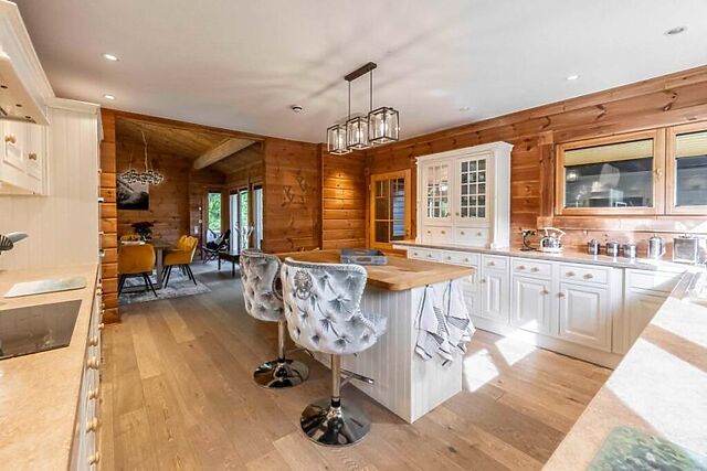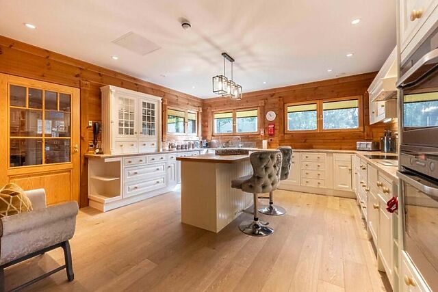 This space also houses the first of two bar areas, positioned close to a generous dining table where everyone can gather. Adjacent is a country-style kitchen with a central island and breakfast bar, providing plenty of room for cooking and socialising.