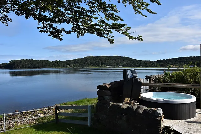 Yes, the accommodation features a private hot tub on the decking area, offering guests a peaceful spot to relax and enjoy the picturesque views of the bay and surrounding mountains.