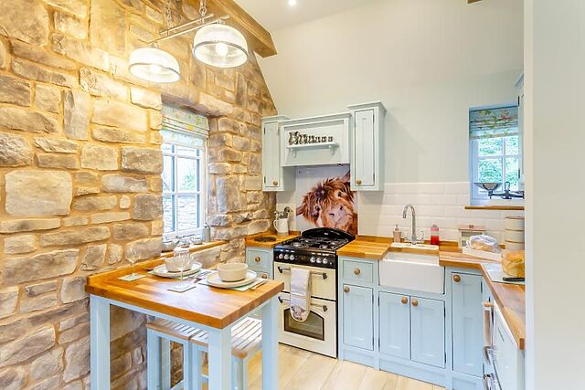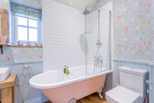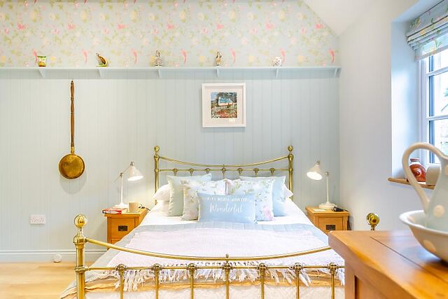 A striking exposed stone wall adds cohesion as this space continues into a cottage-style kitchen and dining area. At the opposite end of the property, wood panelling and pretty wallpaper provide the backdrop for a beautiful brass-framed bed.