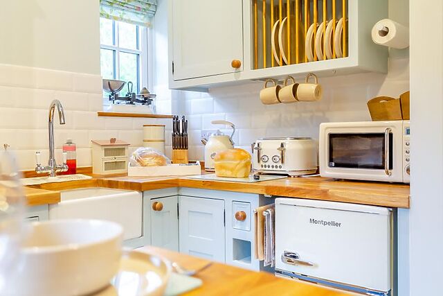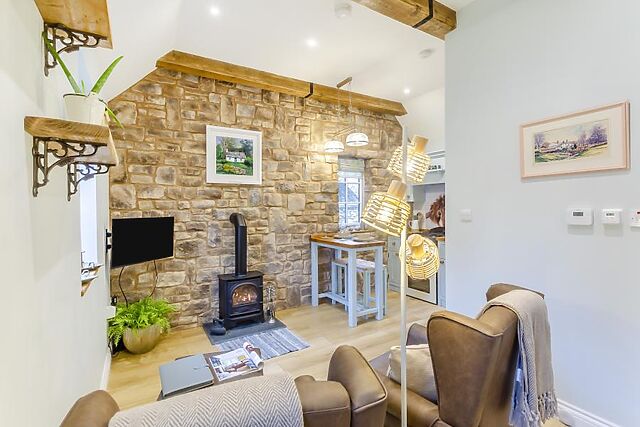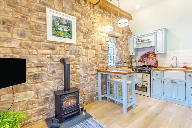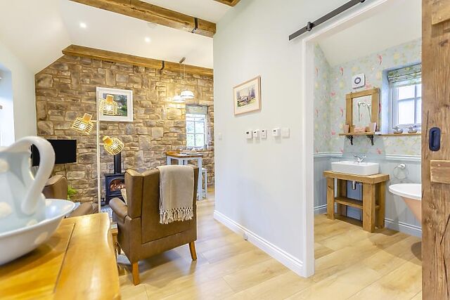 Once home to the boatman who ferried passengers across the river behind the bothy, it’s now a romantic studio-style space for two, renovated to the highest standard and exquisitely detailed. Step inside and at one end of the property, discover the two comfortable armchairs arranged before a Smart TV and a wood-burner-effect gas fire.