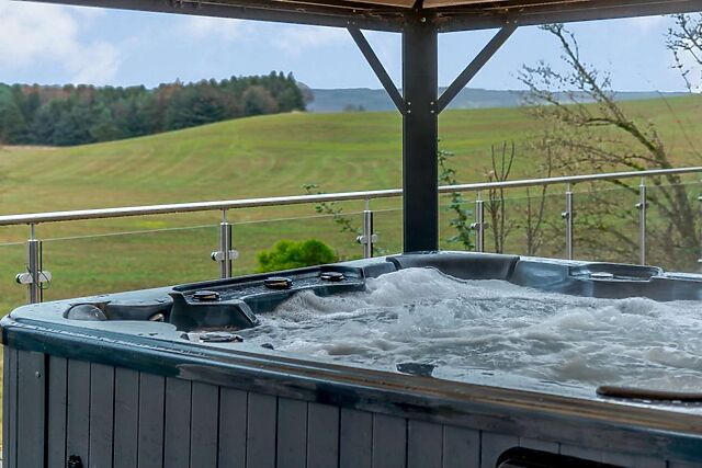 Yes, the property features a private hot tub located on the spacious rear patio, offering guests the perfect spot to relax and admire the wonderful countryside views.