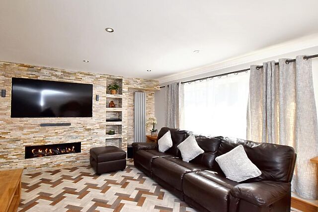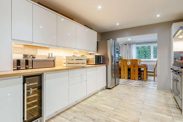 The kitchen is well-equipped with an electric range oven with gas hob, an American-style fridge/freezer featuring smart technology, a wine cooler, dishwasher, and microwave, catering to all your culinary needs.