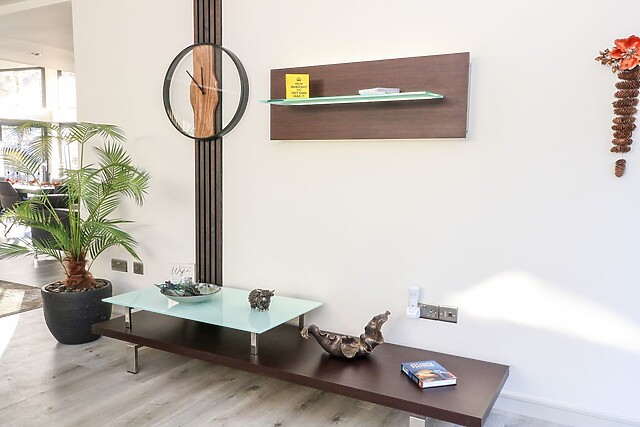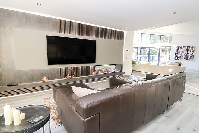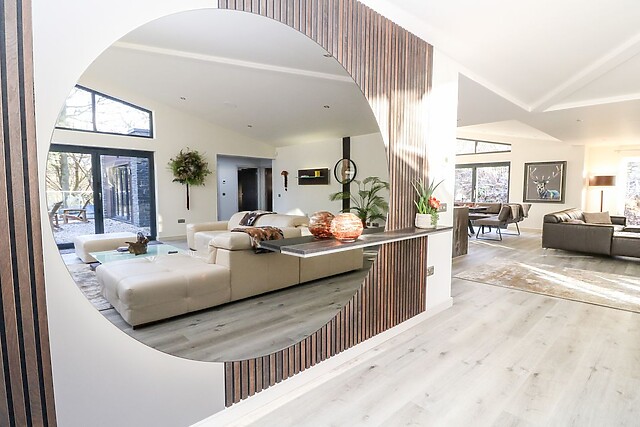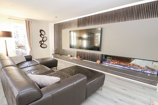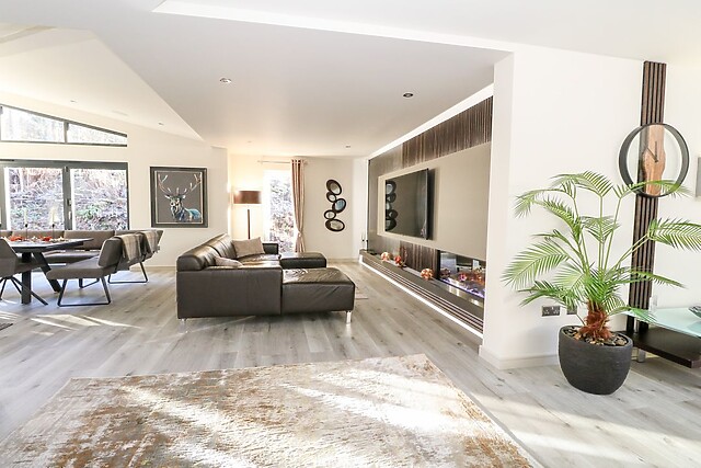 Make the most of the striking kitchen island which has been cleverly positioned to create a highly sociable space․ With its eye-catching 20mm Dekton Trilium worktop finished in beautiful earthy tones it complements the room perfectly and ensures the chef can also indulge in social cooking times. From here, settle into the stunning sitting areas and indulge in a movie marathon, with the feature wall boasting a Smart TV and a feature fire to warm your feet by after a day of walking, as well as earthy tones to remind you that the beautiful countryside is only a short walk away.