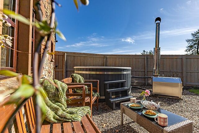 The accommodation boasts a private wood-fired hot tub, inviting you to soak under the stars in a secluded area beside the cottage. The property is a single-storey steading conversion, featuring a cosy open-plan lounge, kitchen, and diner, complete with an open fire for those cooler evenings.