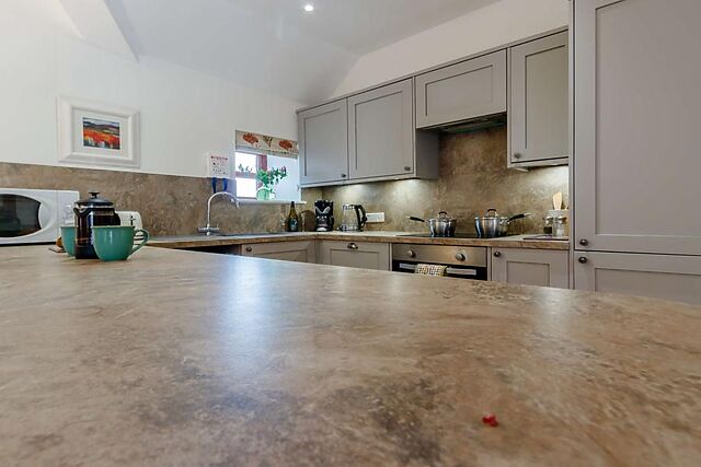 The property is a single-storey steading conversion, featuring a cosy open-plan lounge, kitchen, and diner, complete with an open fire for those cooler evenings.