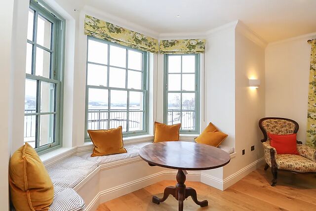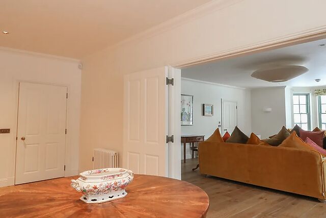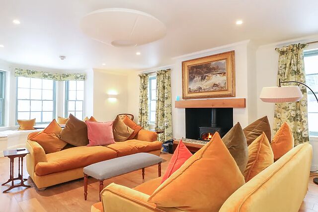 The formal dining room provides a refined setting for special occasions, while the main sitting room is a place to unwind next to a woodburning stove . Next to the stairs, there’s a separate seating area with a couple of comfortable armchairs.