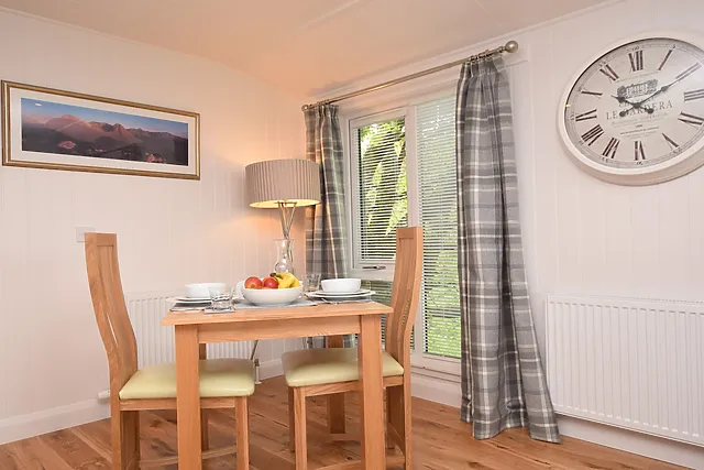 The lodge features a spacious open-plan living area with French doors opening onto an enclosed balcony, where you can indulge in the warmth of the hot tub while admiring the stunning landscape. The well-equipped kitchen and cosy dining area offer the ideal setting for intimate meals with a view.