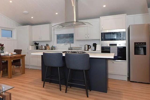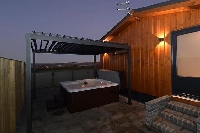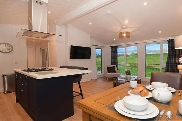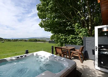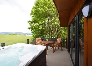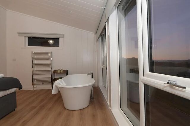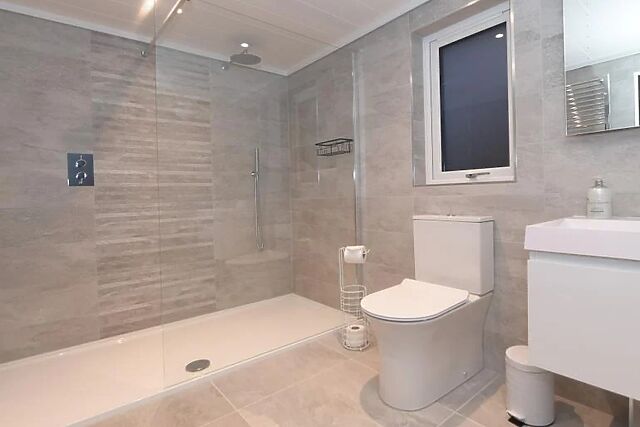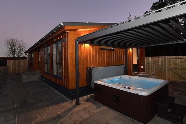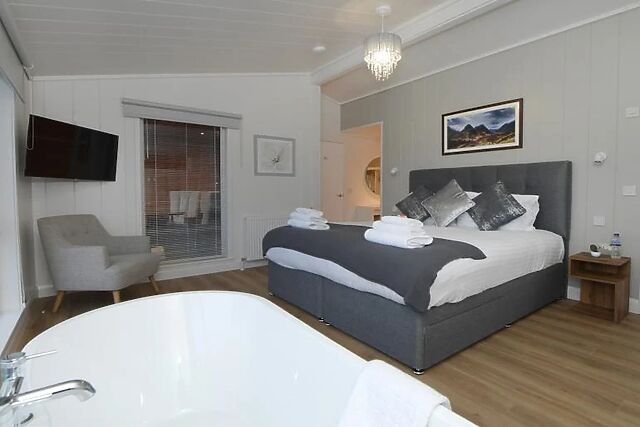 - The en-suite shower room includes a large shower cubicle with double rain shower heads, Bluetooth mirror, WC, and direct access to the private hot tub. Outdoor space and on-site facilities - Fully enclosed balcony and patio can be accessed from both the bathroom and the front of the lodge.