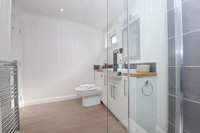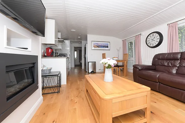 The lodge comfortably sleeps two guests in a sumptuous super king-size bedroom, complete with Smart TV and ample storage space. The open-plan living area, with its stylish lounge and French doors, opens onto an enclosed balcony where you can soak up the serene landscape.