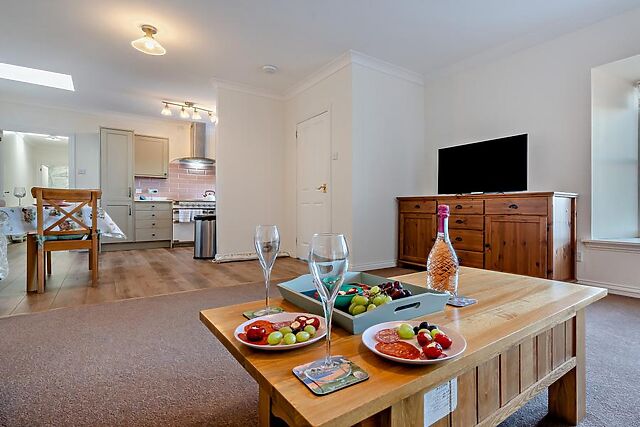 It features comfortable furnishings throughout every room, aesthetically pleasing décor, including the quirky tiles in the kitchen and accents and textures that nod to the property’s countryside surroundings. Take a small flight of external steps up into the property, entering straight into the open-plan living area with a lounge, kitchen and dining room.
