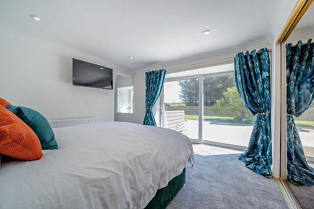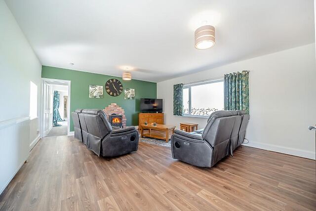 When it’s time to relax into the evening, head to the beautiful lounge with a wood burner, and unwind on the sofa space while the fire crackles away. One of the bedrooms is downstairs – a king-size with an en-suite with a shower over bath.