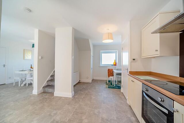 The ground floor features an open-plan kitchen/diner with wooden work tops, a six-person dining table for meals and a handy desk if work calls. This sits opposite a modern shower room with a WC.