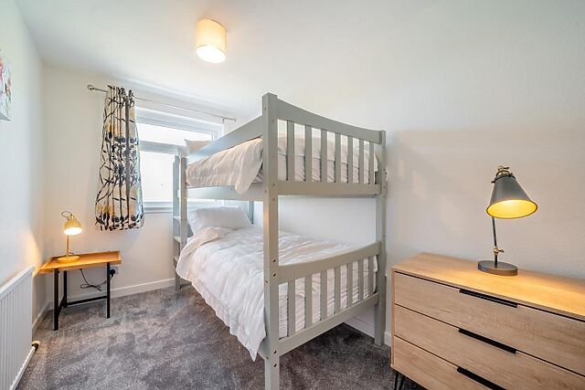 Upstairs, you’ll find a second king-size room and a charming bunk room that’s perfect for youngsters. The main entrance or patio doors from the bedroom lead out to a garden complete with your own private hot tub and outdoor seating.