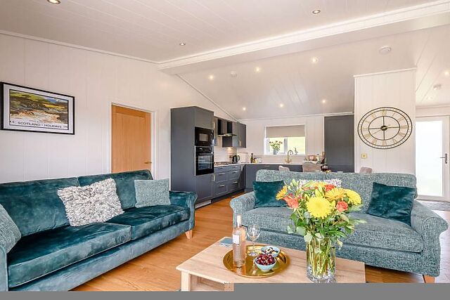The lodge's open-plan living space, complete with all the modern conveniences, offers a sociable area for relaxation.