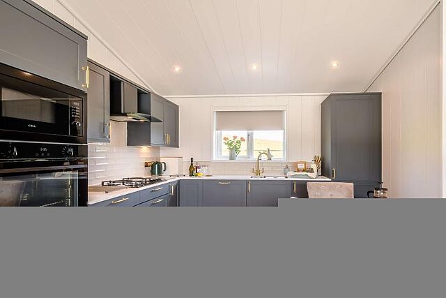The lodge is well-equipped with modern amenities including a Smart TV, Bluetooth speaker, eco-friendly solar panels, and a fully-fitted kitchen with a Tassimo coffee machine, ensuring a comfortable and convenient stay.