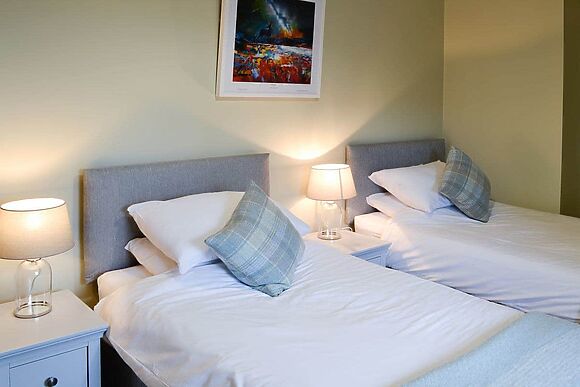 The Byre sleeps 4 guests across 2 bedrooms. Bedroom one has a 5ft kingsize bed. Bedroom two has a zip-and-link setup configured as 2 single beds.