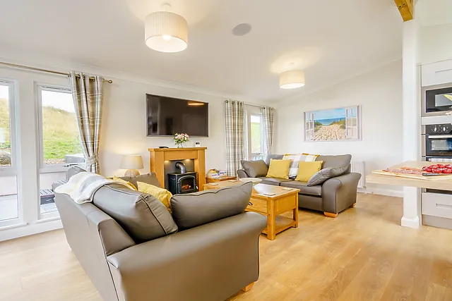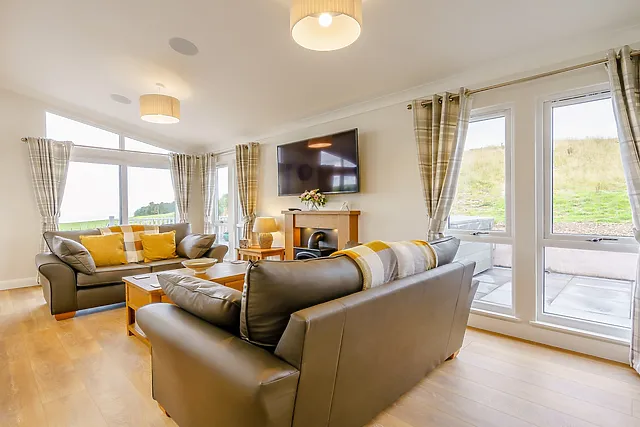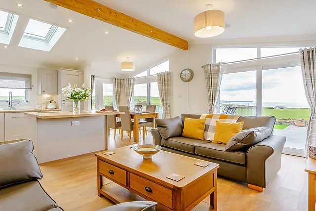 The open-plan living space, complete with floor-to-ceiling windows, bathes the area in natural light, offering uninterrupted sea views. The lodge's modern amenities cater to all your needs, making it an ideal choice for a memorable getaway.