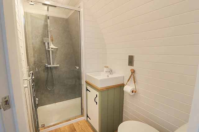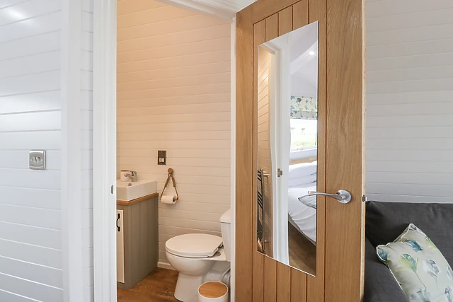 The lodge boasts modern comforts including gas central heating, a smart TV, and a luxurious walk-in shower.