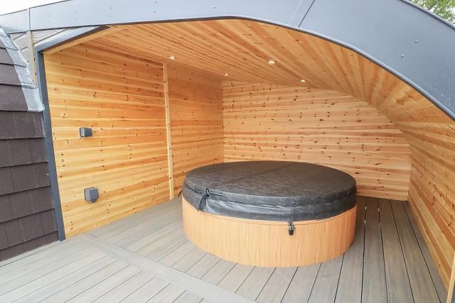 Yes, the accommodation features a luxurious undercover hot tub, offering guests the perfect opportunity to relax and enjoy the stunning countryside views.