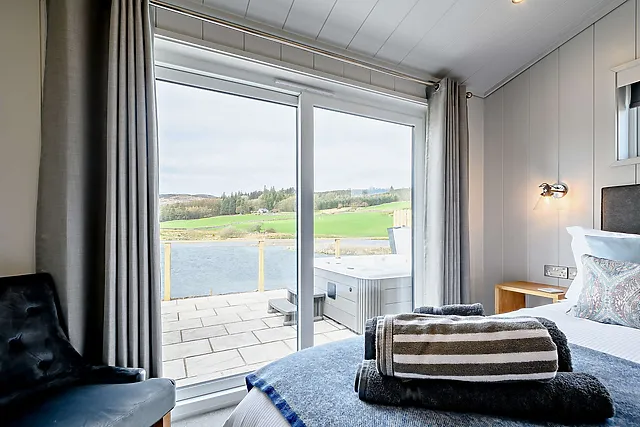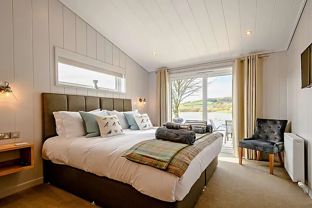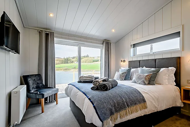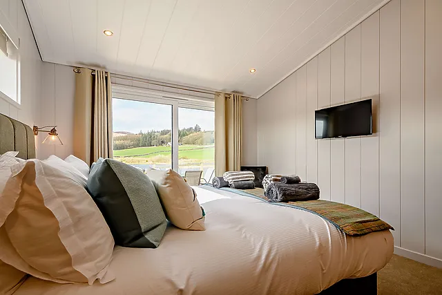 The lodge boasts two beautifully appointed bedrooms. Each bedroom is equipped with a Smart TV and offers stunning loch and countryside views.