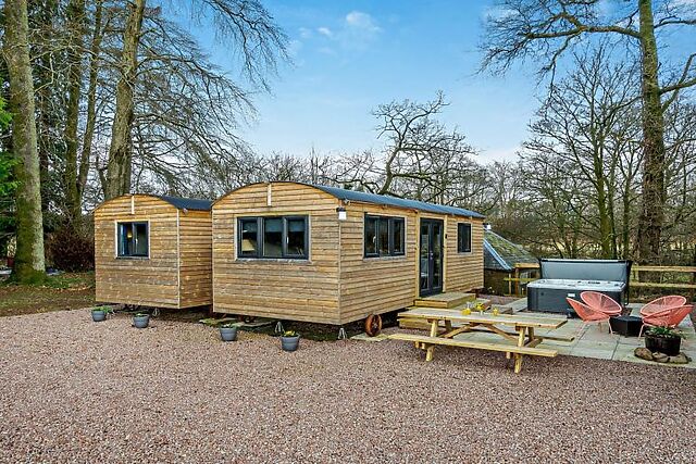 Escape to a tranquil retreat with 'The Bishop', a bespoke handcrafted double shepherd's hut nestled amidst mature woodlands and the serene Evan Water. This unique accommodation is perfect for unwinding in the privacy of a country mansion's gardens, complete with a private hot tub offering picturesque riverside views.