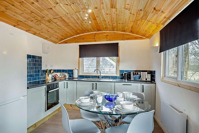 The open-plan kitchen and living area, flooded with natural light from dual-aspect windows, is well-equipped for self-catering, while the outdoor patio invites al fresco dining and stargazing from the warmth of the bubbling hot tub.