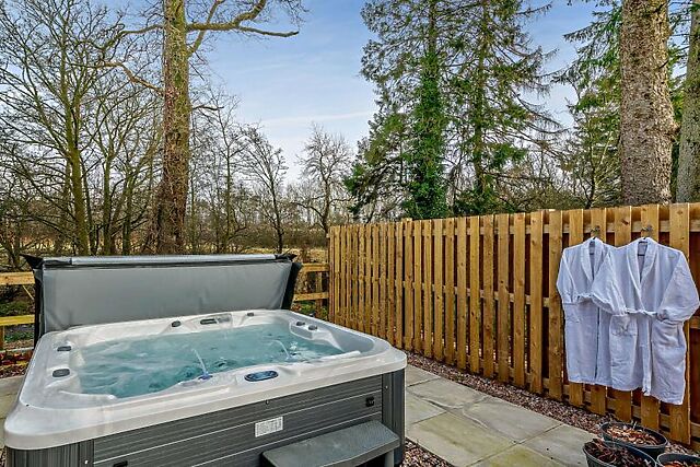 Yes, the accommodation boasts a private hot tub, perfectly positioned to overlook the tranquil River Evan, offering guests a relaxing experience under the stars.