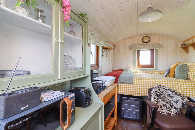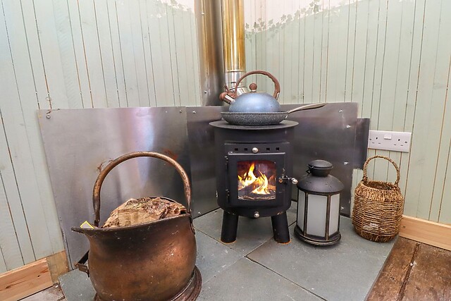 Here, you will find a small kitchen, perfect for preparing romantic meals for two. Adjacent to the kitchen, the sitting area invites you to relax in the plush chair, warmed by the glow of the toasty wood burning stove, creating a warm atmosphere for those chillier evenings.