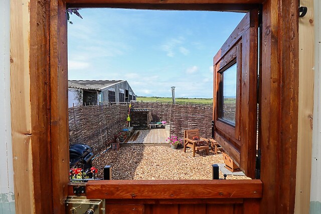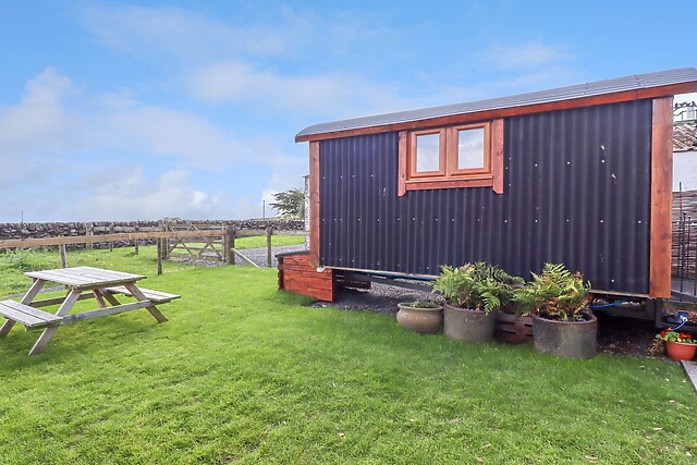 The Black Sheep, a charming, single-storey shepherd's hut tucked away in the serene countryside of Whithorn, Dumfries and Galloway. Perfect for a romantic retreat, this inviting haven features a wood burning stove, a private hot tub, and rural surroundings.