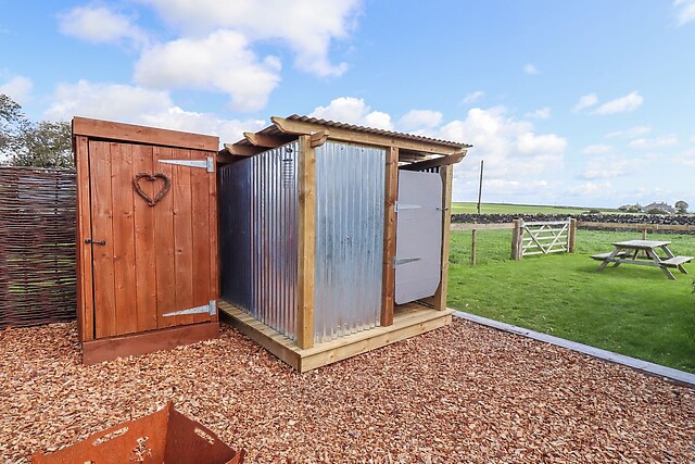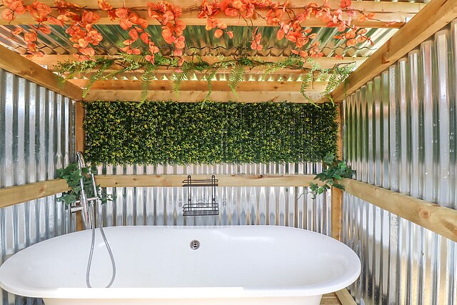 When sleep calls, drift off into a night's embrace in the snug king-size bed, offering a serene sanctuary. The external bathroom, complete with a freestanding bath and overhead shower, provides a space to unwind and soak after a day of exploring the surrounding countryside.