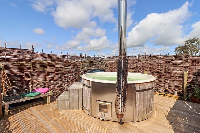 Step outside to discover the enclosed wrap-around garden, a delightful space featuring a lawn and gravel area, complemented by outdoor furniture. Here, you can enjoy alfresco dining, courtesy of the provided barbecue, or simply soak in the wood-fired hot tub while taking in the stunning countryside views.