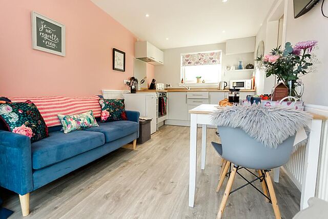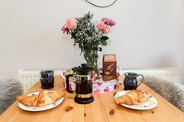 The cheerful lounge is a perfect spot for you both to unwind in at the end of a great day out, with a Smart TV and ample seating. To one side, the dining table is ideal for sharing a romantic meal, which you can rustle up in the elegantly arranged and fully equipped kitchen area.