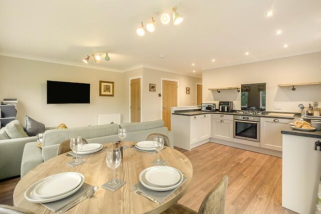 Inside the lodge, a bright open-plan lounge/kitchen/diner creates a sociable hub for your stay. Comfortable sofas face a Smart TV for easy evenings indoors, while the well-appointed kitchen has everything needed for home-cooked meals.