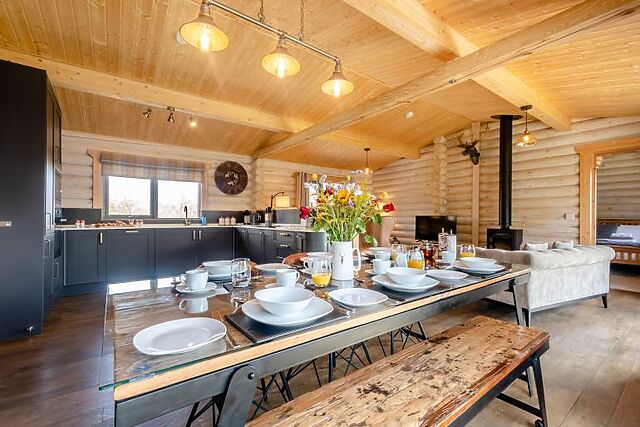 With three cosy bedrooms, including a master with a king-sized bed and en-suite bathroom, this cabin ensures a comfortable stay. Enjoy the open-plan living area, featuring a fully equipped kitchen, dining space, and a lounge with a wood burner.