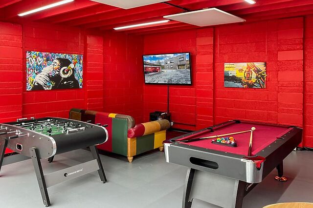 Yes, there is a detached fully equipped games room on-site, featuring a pool table, table football, and a 65" TV with a Sony PlayStation, perfect for entertainment.
