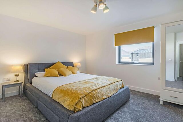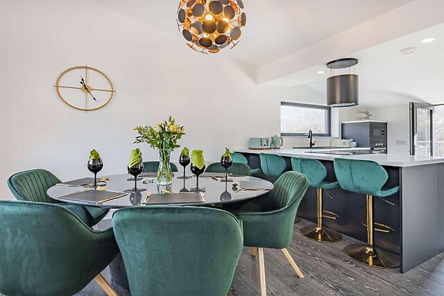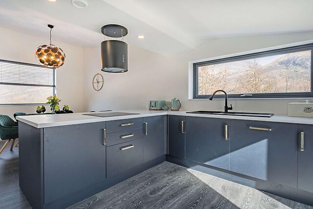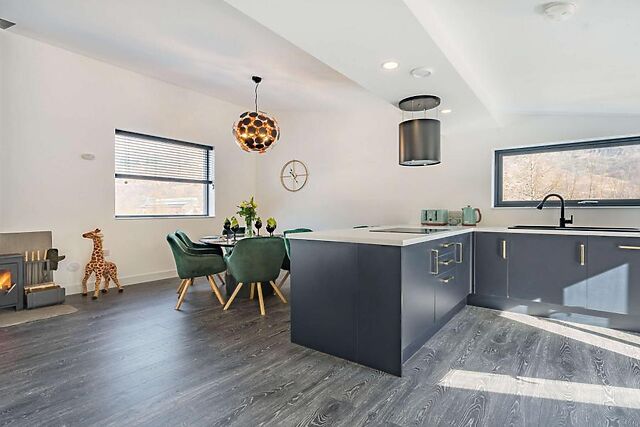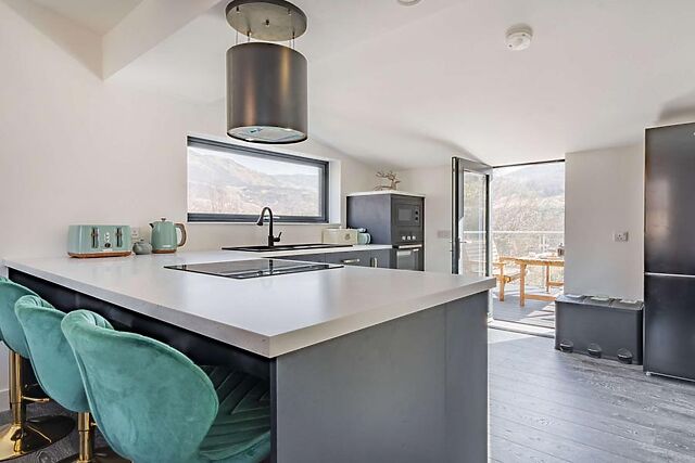 You'll be captivated by the stunning mountain views from the contemporary balcony and the comfort of the private hot tub. The enclosed garden ensures privacy, while the wood burner adds a cosy touch to the spacious open-plan living area.